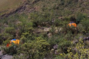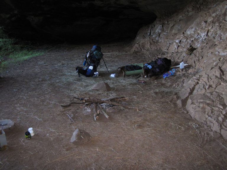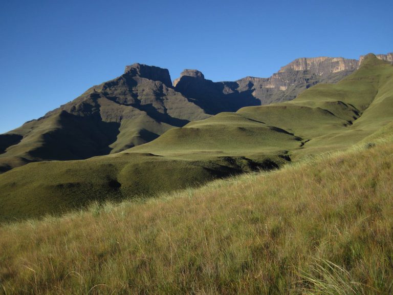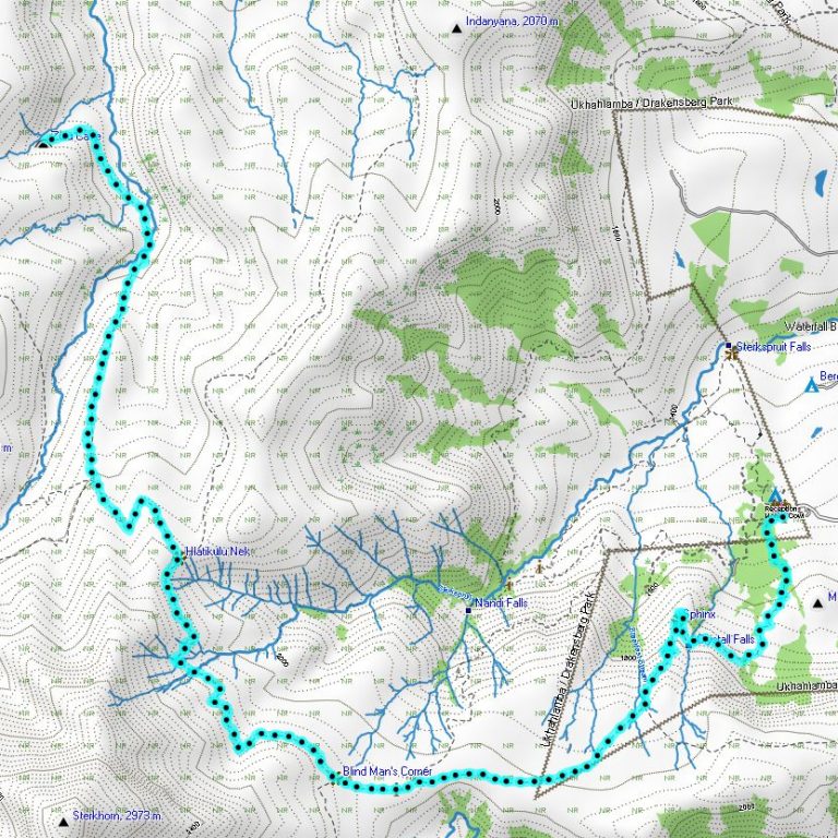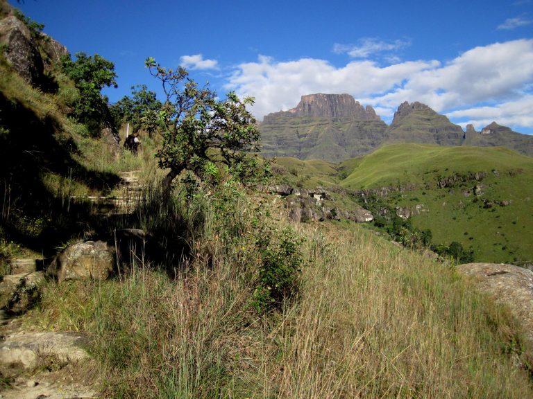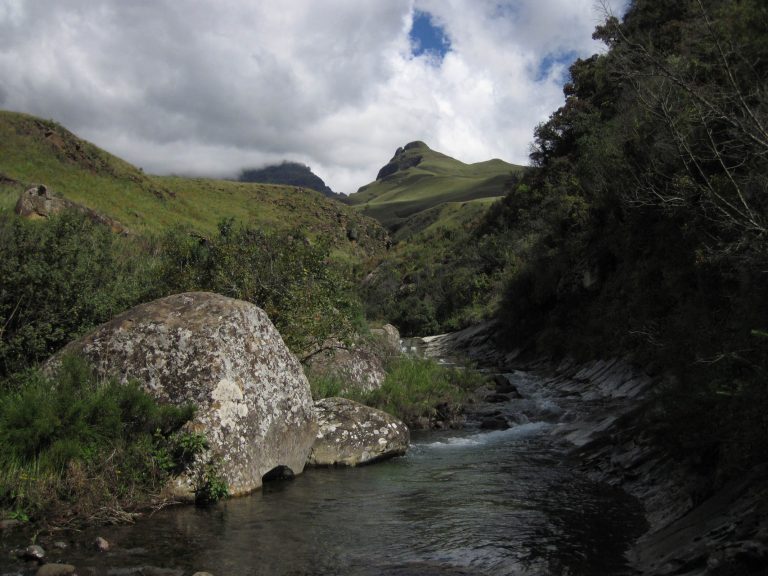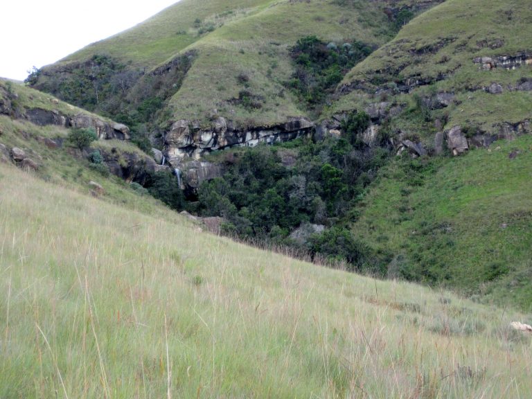 Zulu Cave is situated on a cul-de-sac and fell out of use for a number of years, but being only one of a few caves that can be used for overnight trips it’s worth a visit. The route follows the main path from the Monks Cowl forest station up to the Sphinx and then on to Breakfast Stream. From here you follow the path that slowly takes you closer to the mighty peaks towering over the area and joining the contour path at Blindman’s Corner. Turning left will take you to Injasuthi, but we want to turn right and follow the path all the way to Hlathikulu Neck. Some of the peaks that will tower over you will be Cathkin Peak, Sterkhorn, The Tower and the Amphlett. At the Neck follow the path that leads to Keith Bush Camp, and before you turn off to the left, you will find a feint path that leads off to your right while the main path goes down. The path leads down the spur and you might lose it in places but follow it down the spur keeping a lookout for the proper path. Your aim is to follow the spur to where the two streams meet and after crossing the eMhlawazini River, stick to the left hand side of the stream and follow the path that will first cross a bigger stream and later a smaller stream before crossing a bulbous spur. Once around the spur, it turns up into the valley and you don’t actually see the cave until you actually walk into it. The trees in front of it, not only hides it but gives it protection from the wind and rain. The cave can sleep 12 people with comfort and the waterfall is a source of water as well as a good swimming spot in summer. Unfortunately you don’t have a view of the peaks from the cave, but depending on the time of the day you can explore the valley below the cave as far as you dare to.